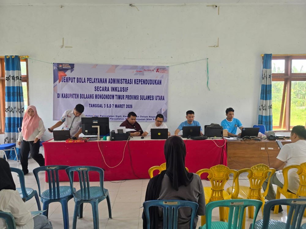 Dalam upaya meningkatkan kualitas pelayanan administrasi kependudukan, Dinas Kependudukan dan Pencatatan Sipil Kabupaten Bolaang Mongondow Timur berkolaborasi dengan Tim dari Direktorat Jendral Kependudukan dan Pencatatan Sipil Kementrian Dalam Negeri menggelar program pelayanan jemput bola pada tingkat kecamatan(04/03/2026). Kegiatan ini dilaksanakan di Kantor Kecamatan Nuangan dan disambut antusias oleh masyarakat.